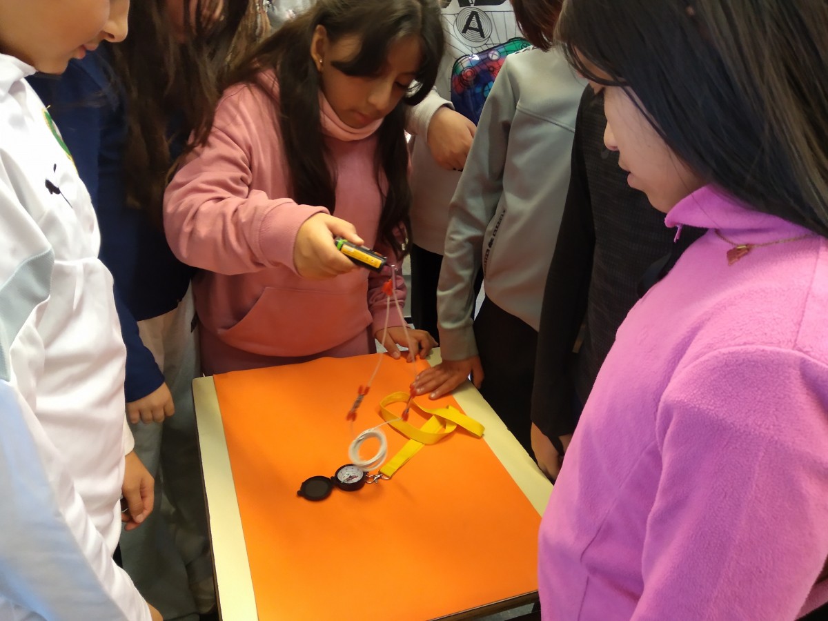 Ens ha impressionat l'experiment que ens heu proposat per que era molt interessant i divertit, i l’hem fet amb molta il·lusió. El més impressionant és que amb un circuit tancat podem fer que la brúixola no miri cap al nord, i mira que no era fàcil perquè ho hem intentat de moltes maneres. A mi personalment m’ha agradat molt la part del circuit tancat; era com fer màgia amb la brúixola! Així hem après que un circuit, quan li passa la corrent té una miqueta de magnetisme i si fem un circuit tancat amb un cable de 1 metre enrotllat, aquest farà un camp magnètic més gran y pot fer que la brúixola no assenyali el nord. A això se le diu electromagnetisme. Això passa perquè el camp magnètic del circuit tancat és més fort que el de la Terra en aquell moment. Laila Doncel